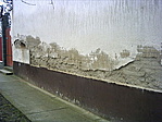 Az épület lábazati része felázik, az ablakok alatt nagy részen le van hullva a vakolat.