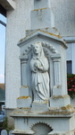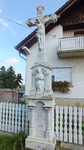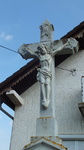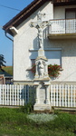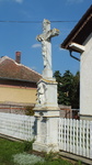 Egy emeletes lakóház előkertje előtt áll a kereszt, jó állapotban van