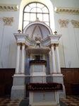 A portikusz felett négyzetes kőkeretben nagy, félköríves karzatablak nyílik. Ívmezejében koszorúk láthatóak. Az ablakon vasrács van. A főpárkány homorúan ívelt, függőlegesen sávozott, kazettás. Felette báboskorlát húzódik. Középen ezt mellvéd váltja fel, ami mögött a négyszögletes alaprajzú torony emelkedik. A kulisszafal két oldalán egyenes záródású, szalagkeretes ajtók nyílnak. Felettük cseppdíszes, triglifes frízes párkány látható, ami felett egy falmezőben könyöklőpárkányos, szalagkeretes ablak nyílik. Felül kőkeretes, félköríves világítóablak látható.