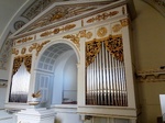 Kétoldalt alacsonyabb faltükrök vannak. Itt két sima törzsű pilaszteren tagolt félkörív emelkedik, amiben körablak található. E fölött többszörösen beugró, sima szalagkeretes, fekvő téglalap alakú faltükör helyezkedik el. A fal tetején egyszerű, alig tagolt kő párkány húzódik.