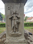 A lépcsős emelvényen álló párkányos pillértörzs mind a négy oldalán egy-egy dombormű látható: Nepomuki Szt. János, Szt. Flórián, Szt. Vendel, Szt. Donát.