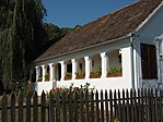 Hosszú épület, a tornáchoz falazott mellvédet építettek, a tornácoszlopok íves árkádokat tartanak.