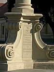Három ágú volutás lábazatra helyezett karcsú oszlopon Mária földgömbön álló alakja (Mária immaculata). A lábazat felirat mezejében töredékes felirat.