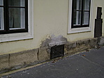 A lábazaton néhol pereg a vakolat.