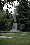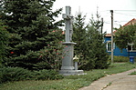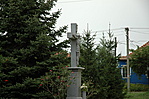 A védett templom (trsz.: 2191) kertjében lépcsős alépítményen álló, hasáb alakú, feliratos talapzaton kőkereszt korpusszal. Megújították 1945-ben.