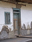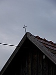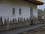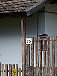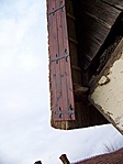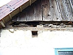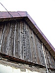 Deszkaoromzata alatt faoszlopokra támaszkodó vízvető, udvari homlokzatán nagy kiülésű eresz.