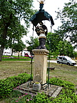 Tér közepén, hasáb alakú, feliratos, lábazattal és párkánnyal ellátott talapzaton álló, festett kőszobor. A szentet papi ornátusban, kezében kereszttel és pálmaággal ábrázolja. Felette fém esővédő tető. Állíttatta Fehér Mihály hajóslegény 1818-ban.