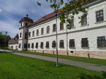 Téglány alaprajzú, egyemeletes, kontyolt nyeregtetővel fedett, két saroktoronnyal ellátott épület, mely kétoldalt kapukkal csatlakozik a szabálytalan udvart övező földszintes részekhez, az egykori kiskastélyhoz.
