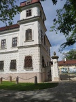 Keleti, tóra néző homlokzata két szélén egy-egy háromszintes saroktorony emelkedik. A földszint rusztikázott, ez ráfordul a nyílások szemöldökére. A földszintet és az emeletet erőteljes kiülésű övpárkány választja el egymástól. Az emelet függőleges falsávokkal tagolt. A homlokzatot teljes főpárkány zárja.