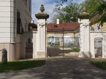 A homlokzathoz délről nagyméretű kapuépítmény csatlakozik, benne kosáríves kapuval. A kapuépítmény szintén rusztikázott, fogrovátkolt főpárkánnyal ellátott. Felette kívülről 1897-es, belülről 1874-es évszám látható.