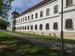 A nyugati homlokzat 13 tengelyes, a két szélső tengely földszintjén azonban nincs nyílás. A középtengelyben az épület főbejárata figyelhető meg, a homlokzat síkjából kiugró bejárati építmény felett az emeleti nyílás kis erkélyre vezet.
