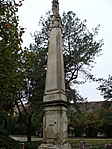 Háromszögű alaprajzú, párkánnyal és lábazattal ellátott talapzaton álló háromszög alaprajzú obeliszk, tetején felhőkoszorún Mária Immaculata-szobor (Schweiger Antal). Az 1410 körül épült, 1780-ban lebontott Szent Balázs-plébániatemplom főoltára helyén emelték.
