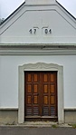 Homlokzatán egyenes záródású kőkeretes ajtó, eredeti fa ajtószárnyak (erősen átmázolva), a felső keret hullámvonalas, csigás vájatokkal díszítve.