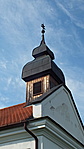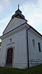 Egyhajós, oromzatos homlokzat mögött fa huszártoronnyal, azon törtvonalú, bádogfestésű sisak.