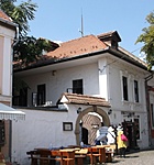 Az épület bal oldalához csatlakozó, cseréppel lefedett kerítésfalban kosáríves kőkeretes barokk kapu nyílik, rombuszmintás kapuszárnya barokk asztalosmunka.