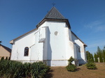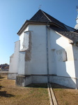 A szentély poligonális záródású, középső tengelyében egy rézsűs körablak és három támpillér látható.