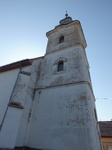 A torony szintjeit osztópárkányok tagolják. Az első szinten félköríves, szalagkeretes ablak, fölötte lévő két szinten is ugyanilyen ablakok és a fölött félórapárkány. A toronysisak többszörösen tört bádog.