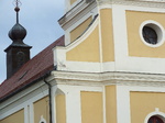 A torony enyhe rizalittal ugrik előre a hajóból, melyhez íves oromzattal csatlakozik. A torony sarkai lekerekítettek, a sisak tört, párnázott réz.