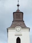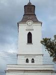 A hajó nyugati végén álló 2 szintes torony az első szinten oldalanként, vakolattükrökben neogót ablak párok ülnek. Egyszerű osztópárkánya felett a harangszinten, a négy oldalon nagyobb neogót ablakok nyílnak, felettük fél órapárkány óralemezekkel. Törtvonalú, hasábtagos gúlasisakja fémlemez borítású.