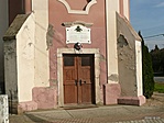 A déli fal első szakaszában egyenes záródású, zárókődíszes, keretezett ajtó. A déli falhoz kontyolt nyeregtetős sekrestye kapcsolódik.