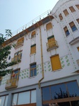 A visszafogott stílusú épület homlokzata homorú és domború felületek váltakozására, szimmetriára és asszimetriára épül. Szent László téri homlokzatát háromszögoromzat díszíti. A homlokzatokon visszafogott, népi varrottasokat idéző motívumok jelennek meg fehér és zöld majolikából. Az ablakok elosztása változatos, az első és második emeleten egyenes lezárású, egyszerű ablakok, míg a harmadik emeleten lecsapott sarkú ablakok vannak. Egyszerű, geometrikus rácsozatú erkélyek teszik dinamikussá. A Zöldfa utcai bejárat dongaboltozatos folyosóra nyílik, innen lehet az emeletre vezető lépcsőházba jutni, amelyek kivezetnek a geometrikus díszítésű korlátráccsal szegélyezett körerkélyre.
