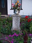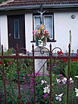 A kereszt felirata igen nehezen olvasható, a szavak egy részét inkább csak érzésre töltöttem ki. Egyébként egy magánház kertjében áll, talapzata és a kereszt is elég kicsike.
