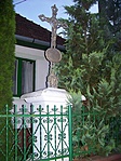 A kereszt egy magánház előkertjében van.