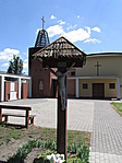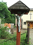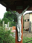 Nem fém kereszt, mint ahogyan az első jelentésben látszik! Fa kereszten fém (alumínium) öntvény test. Zsindelyes tető ami rossz állapotú.