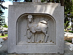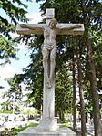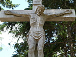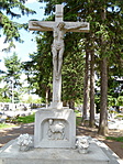 "A temetőben általában nagyméretű középkereszt is található. Mindenki keresztje ez, és az idegen földben nyugvó honfitársainké. Az első középkereszt fából készült. Később a község 3000 pengőért, műkőből készíttetett egy feszületet, Bernát Jánosné, született Martha Milligan amerikai származású szobrászművésszel. A kőkereszt megfeszített Krisztus modellje maga Bernát János (1910-1964), dombóvári származású festőművész volt. 1940. szeptember 8-án körmenetileg vonult az egész lakosság a templomból a temetőbe, a keresztszentelés ünnepén. Kocsis László plébános végezte a szertartást, tábori misével egybekötve. 1952-ig az egyházi "keresztjáró napokon" ehhez a kereszthez is kivonultak körmenetileg a hívek a pappal együtt, nemkülönben az eredeti Szent Vendel-szoborhoz is, amely a LIDL Áruház helyén állt. Később a hatóság nem engedélyezte ennek az ünnepnek a megtartását."