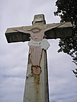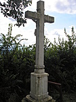 Az udvar eldugott részén álló kereszt arccal egy meredek, bokros lejtőre néz, előlről nehezen fotózható.