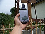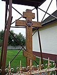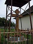 A kereszt Sényőn a görögkatolikus harangláb előtt áll, jó állapotú.