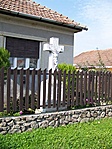 A kereszt egy magánház előkertjében áll, felirat nem látszik rajta.