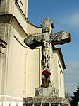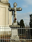 A kereszt a templom előkertjében áll, kissé kopottas, málladozó.