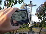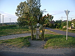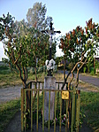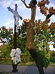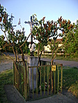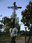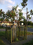 Útmenti kereszt védőkerítéssel és néhány fácskával körülvéve.