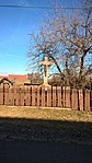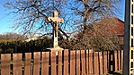 A kereszt egy magán ház kerítésén belül található.