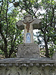 Egy ház előkertjében áll, beton, műkő gazdagon díszitett oszlopon, szines festett, Mária abrázolással.A test réz öntvény lehet, megkopott repedezik.