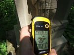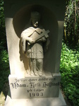 Szépen felújított kereszt, és szerencsére ez a felújítás megtartotta a szobrok és a felirat eredeti kinézetét! A Hoffman szó n-jének a tetején egy vízszintes vonal szerepel, gondolom, ezt azt jelenti, hogy hosszú n lenne, csak nem fért ki. A feleség leánykori nevét én Linzannak olvasom, de ez elég furcsán hangzik, lehet, hogy nem az van odaírva.