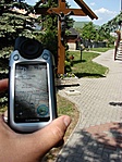 A kereszt a Katolikus plébánia udvarán áll. A kerítésnél mértem a koordinátát.