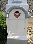 Egy szépen felújított ház előtt áll a kereszt, a talapzatán egy szíven (?) lévő fej látható.