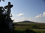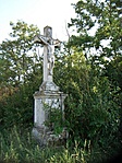Viszonylag ép, de kopott erdőszéli kereszt, szép panorámával.