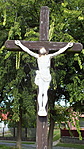 Barnára festett fakereszt, fém korpusszal.