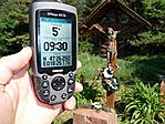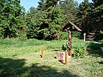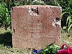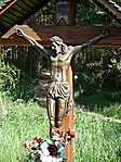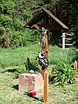 Igényes fakereszt szép korpusszal. előtte vörösmárvány blokk, rajta felirat.