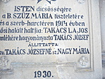 ISTEN dicsőségére a B.SZŰZ MÁRIA tiszteletére és a szerb harctéren 1914 évben hősi halált halt fia: TAKÁCS LAJOS emlékére hagyományozta TAKÁCS JÓZSEF