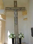 Régi talapzaton új kereszt, egy műemlék haranglábban áll.