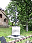 A kereszten semmilyen látható felirat nincs, valószínűleg azért, mert mostanában újíthatták fel: kívülről műkő burkolatot kapott. A kereszt fémből van.