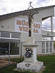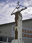A kereszten nincs felirat. Egy idősebb helybeli mondta, hogy Polyák keresztnek hívják. Elég csúnyán ráépítettek egy autókereskedést...