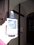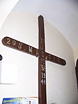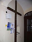A kereszt a katolikus templom bejáratán belül van, a falon, csak akkor látható, ha a templom ajtaja nyitva van.