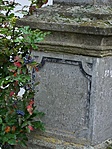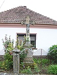 A kereszt egy magánház kertjében áll, felirata nehezen olvasható.