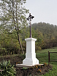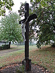 A kereszt talán vöröses homokkőből készült, felirata nincs. Közvetlenül a rk. templom előtt rendezett környezetben található. Alapja a szokásostól eltérően ívelt.