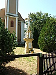 Kicsit kopott kereszt a templomkertben, a felirat külön márványtáblán van rajta.